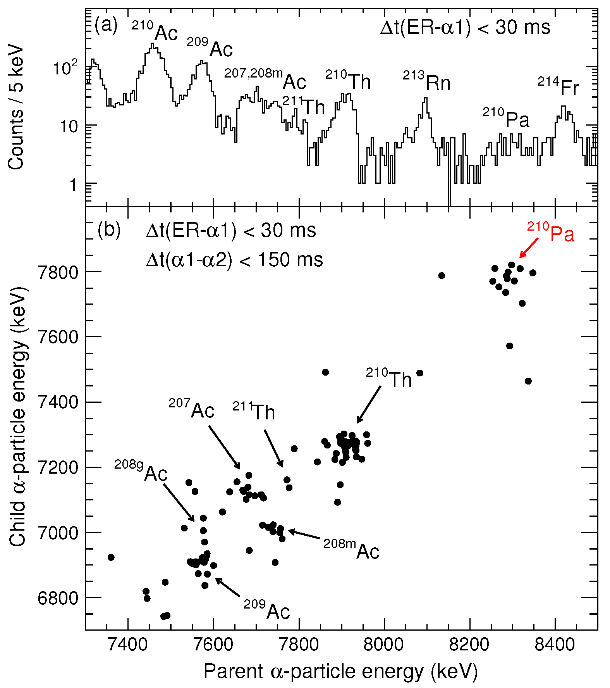 研究團(tuán)隊(duì)利用中國(guó)超重元素研究加速器裝置(CAFE2)提供的鈣-40束流轟擊镥-175靶,通過(guò)熔合蒸發(fā)反應(yīng),在充氣反沖核譜儀(SHANS2)上成功合成了質(zhì)子滴線外新核素鏷-210,并成功測(cè)量了該核素的α衰變能量和半衰期。
