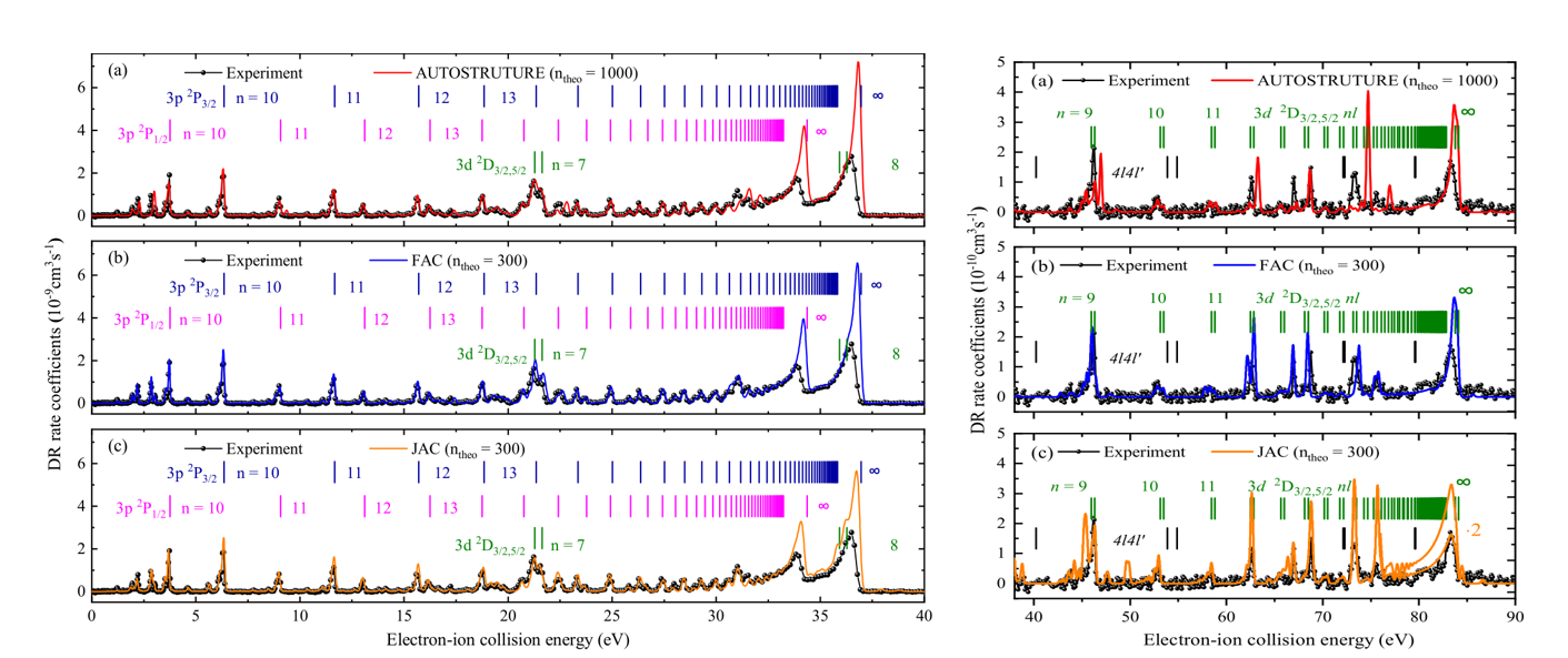 基于蘭州重離子加速器冷卻儲存環(huán)開展的高電荷態(tài)離子的雙電子復合精密譜學實驗具有較高的能量分辨,且其電子-離子相對能量可大范圍精密調(diào)制,是目前唯一能夠精確測量低能碰撞復合截面關鍵數(shù)據(jù)的實驗方法??蒲袌F隊在對M殼層類鈉鐵離子 Fe15+的實驗中,成功測量了 0-90 eV 能量范圍內(nèi)的復合速率系數(shù)。他們將實驗結(jié)果與最新的理論Flexible Atomic Code (FAC) 、AUTOSTRUCTURE、Jena Atomic Calculator (JAC)計算的結(jié)果仔細對比,解析出每個共振結(jié)構(gòu)的來源。同時,科研人員從雙電子復合速率系數(shù)得到了可用于等離子體建模的等離子體速率系數(shù),并與此前的理論數(shù)據(jù)作了對比研究。