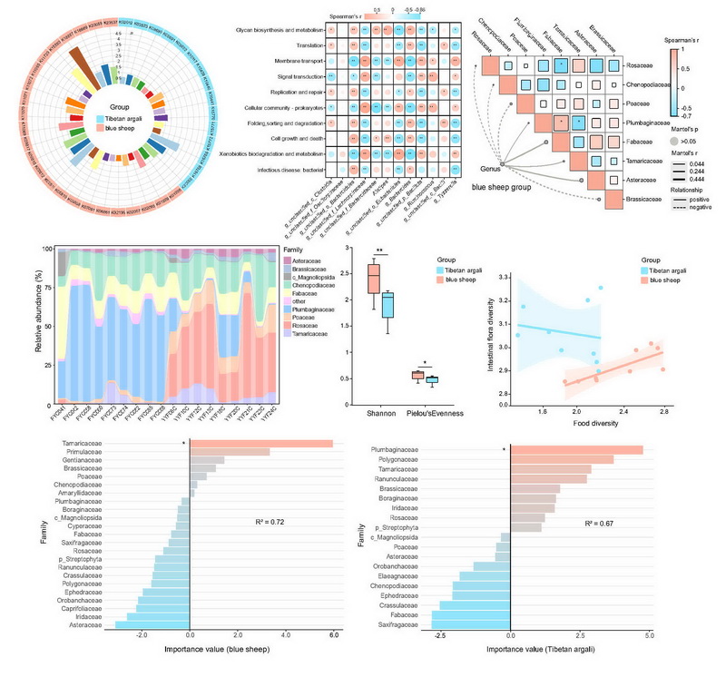 中國科學(xué)院西北高原生物研究所動物生態(tài)與資源保護(hù)研究團(tuán)隊在青海省昆侖山地區(qū)采集了西藏盤羊與巖羊的新鮮糞便樣本,結(jié)合宏基因組測序與植物 trnL片段的高通量測序技術(shù),深入分析了兩者腸道菌群組成、功能特征及食性結(jié)構(gòu)與腸道菌群在生態(tài)適應(yīng)與營養(yǎng)生態(tài)位分化中的潛在作用。研究發(fā)現(xiàn),西藏盤羊與巖羊共棲于高寒生態(tài)環(huán)境中,但其腸道菌群在組成結(jié)構(gòu)與功能特征方面表現(xiàn)出了顯著差異。食性多樣性的高低并不必然反映腸道菌群多樣性的水平,其中西藏盤羊雖食性相對單一,但其腸道菌群多樣性更高,具有更強(qiáng)的代謝適應(yīng)性與纖維降解能力;而巖羊擁有更廣泛的植物攝食譜,卻表現(xiàn)出在糖類代謝相關(guān)功能上更強(qiáng)的腸道菌群代謝適應(yīng)能力。綜合來看,腸道菌群與食性之間的協(xié)同作用可能在推動兩物種營養(yǎng)生態(tài)位分化中發(fā)揮重要作用。此外,兩種動物在抗生素耐藥基因組成上也存在差異,提示該類指標(biāo)在未來野生動物健康評估中具有潛在應(yīng)用價值。本研究揭示了腸道菌群作為宿主環(huán)境適應(yīng)和生態(tài)位分化的重要調(diào)控因子,其與食性協(xié)同作用推動了高原野生動物的生態(tài)位分化。研究成果為理解大型食草動物腸道菌群與環(huán)境適應(yīng)及生態(tài)位分化提供了全新視角,也為瀕危物種保護(hù)和高原生態(tài)系統(tǒng)可持續(xù)發(fā)展提供了重要參考。