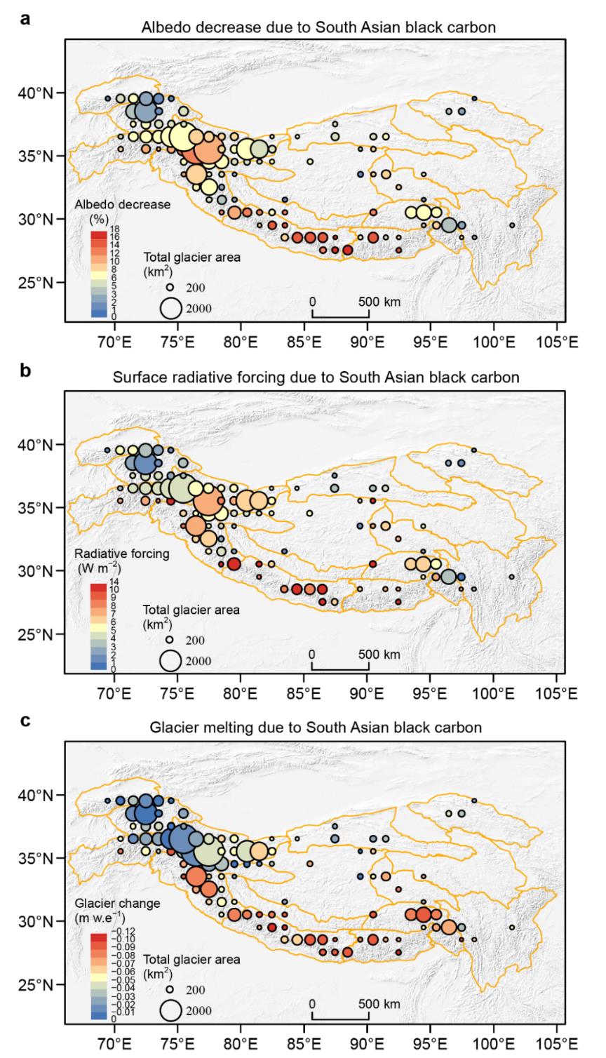 近日,中國科學(xué)院西北生態(tài)環(huán)境資源研究院康世昌研究員課題組,聯(lián)合清華大學(xué)陳德亮教授、美國猶他州立大學(xué)猶他州氣候中心Robert教授,發(fā)現(xiàn)南亞黑碳?xì)馊苣z通過增加消融和減少冰川物質(zhì)補(bǔ)給,加速了以冰川退縮為主的青藏高原固體水儲量損失,尤其在喜馬拉雅地區(qū)及其孕育的印度河、恒河-布拉馬普特拉河流域最為顯著。