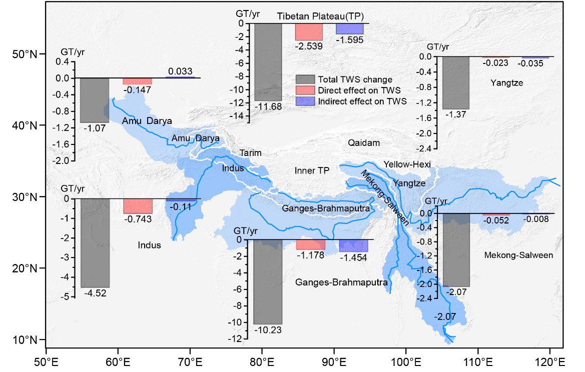 結(jié)果表明,2007至2016年間,南亞黑碳沉降使青藏高原冰川反照率降低,導(dǎo)致消融量增加7.5%;同時南亞黑碳導(dǎo)致的高原降水減少帶來冰川物質(zhì)負(fù)平衡(虧損)增多6.1%;其中,喜馬拉雅地區(qū)尤為顯著,冰川物質(zhì)負(fù)平衡增幅達(dá)到33.7%。冰川物質(zhì)虧損導(dǎo)致陸表水儲量減少,其中青藏高原南部流域陸表水儲量減少顯著,尤其在印度河與恒河-布拉馬普特拉河等內(nèi)流盆地。