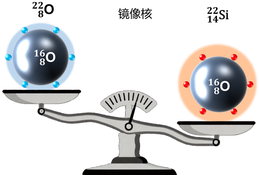 圖:硅-22及其鏡像核氧-22結(jié)構(gòu)示意圖。通過硅-22的質(zhì)量測量,結(jié)合理論計算,科研人員揭示了硅-22具有與氧-22相似的雙幻結(jié)構(gòu),但同時存在輕微的對稱破缺,具有更外延的質(zhì)子空間分布。(圖源/近代物理所)