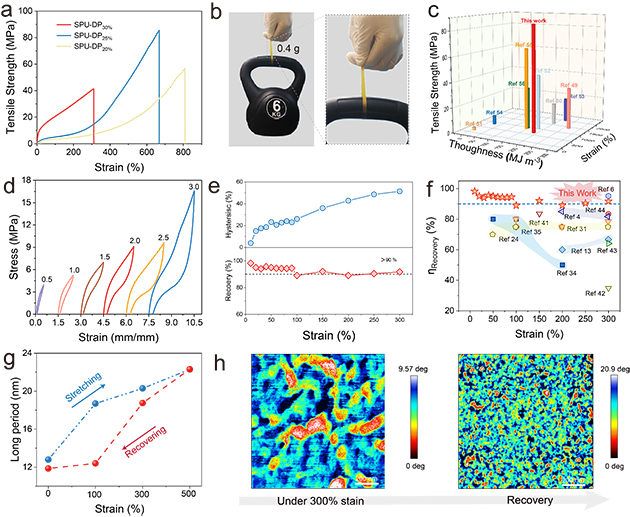 最后,研究人員通過機械性能測試證明,利用動態(tài)硬域精準(zhǔn)控制微相分離,成功實現(xiàn)了聚氨酯彈性體在力學(xué)性能上的調(diào)控,突破了長期以來高強度和高彈性無法兼容的瓶頸。調(diào)控優(yōu)化后的聚氨酯彈性體斷裂強度超過80MPa以上,該拉伸強度超過了目前已報道的大多數(shù)人工合成彈性體。此外,該優(yōu)化的聚氨酯彈性體在短程應(yīng)變下表現(xiàn)出超過90%的回彈效率,且在長程應(yīng)變下超過88%,該回彈效率也超過了目前所報道的大多人工合成彈性體,在短程變形時甚至可與生物彈性蛋白相媲美。