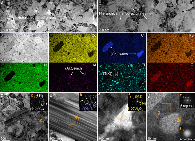 圖1. Co25Ni23Cr20Fe20Ti6Al4B2高熵納米復(fù)合材料的高密度分級(jí)異質(zhì)性結(jié)構(gòu)
