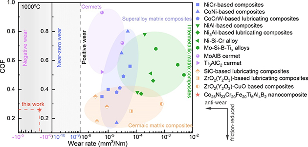 圖2. 各類已報(bào)道高性能抗磨材料在1000 ℃的摩擦學(xué)性能對(duì)比