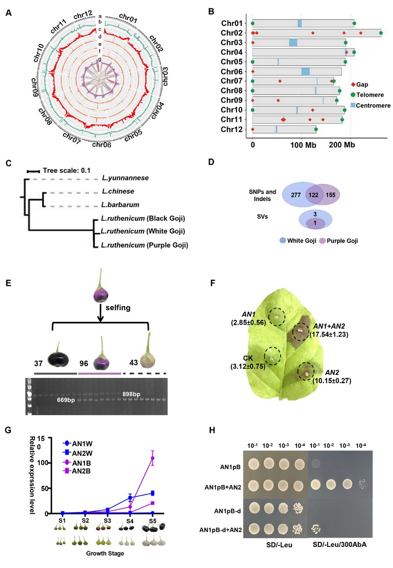 圖?黑果枸杞高質(zhì)量基因組及229 bp AN1 啟動子缺失導(dǎo)致果色分化。(A) 染色體基因組特征分布。(B) 缺口、端粒和著絲粒位置。(C) 枸杞屬系統(tǒng)發(fā)育樹。(D) 白、紫與黑果枸杞間花青素相關(guān)變異。(E) 紫果后代果色分離及基因型鑒定。(F) AN1/AN2 在煙草瞬時(shí)表達(dá)。(G) 白果與黑果 AN1/AN2 表達(dá)動態(tài)。(H) Y1H 驗(yàn)證 AN2 與 AN1 啟動子的結(jié)合。