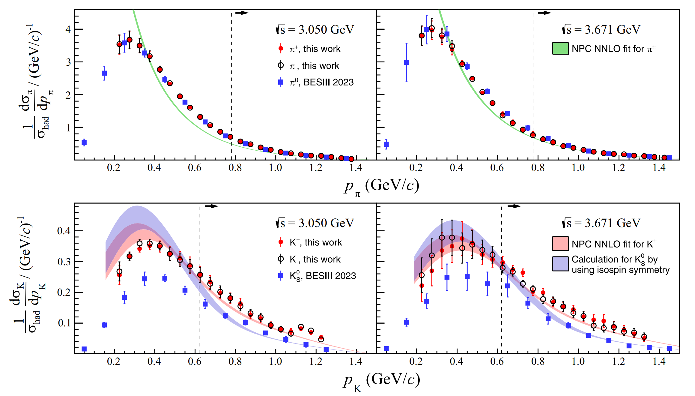 面對(duì)這一挑戰(zhàn),團(tuán)隊(duì)利用北京譜儀(BESIII)能量掃描數(shù)據(jù),精確測(cè)量了帶電pion和Kaon介子單舉產(chǎn)生微分截面,最高精度達(dá)1%~2%。結(jié)合NPC合作組(Non-perturbative Physics Collaboration)的全局?jǐn)?shù)據(jù)擬合研究,這一新的測(cè)量結(jié)果與基于次次領(lǐng)頭階(NNLO)精度的量子色動(dòng)力學(xué)(QCD)理論分析相符合,尤其是大動(dòng)量強(qiáng)子區(qū)域(如圖2所示)。該研究成果為檢驗(yàn)低能區(qū)QCD因子化定理及部分子碎裂過程中同位旋對(duì)稱性的有效性提供了有力的實(shí)驗(yàn)支持,對(duì)深入理解強(qiáng)相互作用動(dòng)力學(xué)具有重要意義。