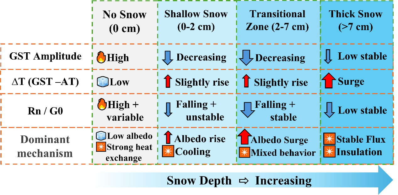 據(jù)此研究提出了“四區(qū)間機(jī)制框架”,即裸地—薄雪(0–2 cm)—過(guò)渡雪(2–7 cm)—厚雪(>7 cm)。該框架刻畫了從強(qiáng)地–氣耦合的冷卻階段,跨越閾值進(jìn)入穩(wěn)定保溫階段的演變路徑,為淺雪主導(dǎo)區(qū)的雪–地相互作用提供了可操作的判據(jù)與參數(shù)化思路。