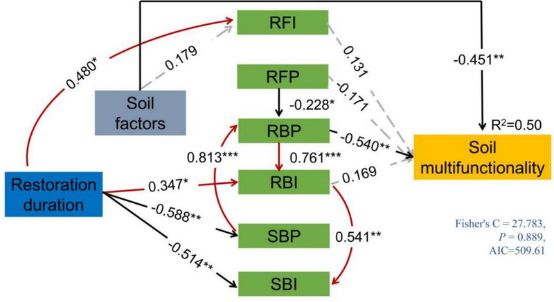 圖1 不同恢復年限的檸條(Caragana korshinskii)人工林下,恢復年限、土壤因子以及土壤和根際微生物群落特征對土壤多功能性的影響