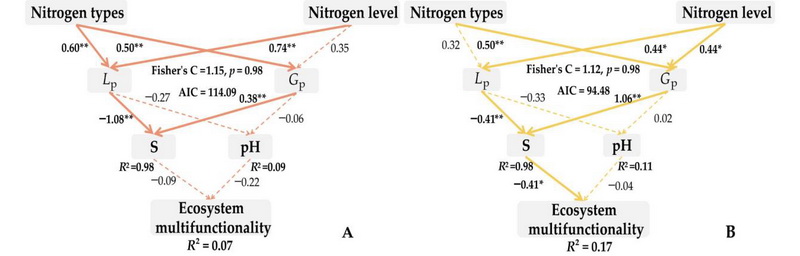 圖2 分段式結構方程模型展示了各變量對生態(tài)系統(tǒng)多功能性的影響(A 長期氮添加,B 短期氮添加)