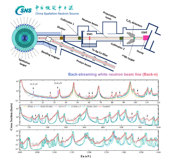 在中子俘獲反應(yīng)研究方面,研究團隊基于中國散裂中子源反角白光中子束線(CSNS Back-n),利用高純度銠-103靶材開展了1eV-1MeV能區(qū)中子俘獲反應(yīng)截面的直接測量。實驗結(jié)果表明,國際主要評價數(shù)據(jù)庫ENDF/B-VIII.1,JEFF-3.3和JENDL-5中11.9 eV和33.0 eV處標注的共振能級并不存在。分析認為,上述數(shù)據(jù)庫中的共振峰可能源于早期實驗樣品中鉑族元素鈀(108Pd)與鉑(195Pt)雜質(zhì)的貢獻。此外,基于CSNS Back-n束流的高注量率和優(yōu)異的飛行時間分辨能力,本次實驗首次發(fā)現(xiàn)了銠-103的8個新共振峰,并利用R-矩陣程序SAMMY提取了相應(yīng)的共振參數(shù)。