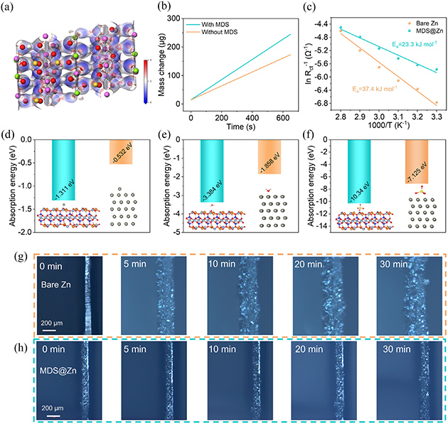 圖3. (a) MDS的靜電勢(shì)(ESP)分布圖。(b) 電化學(xué)石英晶體微天平(EQCM)測(cè)試中,有無MDS層時(shí)電鍍過程的質(zhì)量變化圖。(c) 基于電荷轉(zhuǎn)移電阻計(jì)算的裸鋅和MDS@Zn陽極的活化能。(d)、(e)、(f) 分別為Zn2+、H2O和SO42–在裸鋅和MDS陽極(002)晶面上的吸附能圖。(g) 裸鋅陽極和 (h) MDS@Zn陽極在10mA cm–2電流密度下鋅沉積過程的原位光學(xué)顯微鏡圖像。