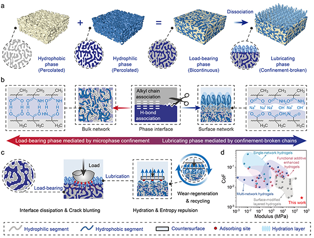 在人體關(guān)節(jié)中,軟骨依托多尺度膠原網(wǎng)絡(luò)、多相組分及其界面的協(xié)同作用,構(gòu)建出兼具高承載與超低摩擦的天然潤滑系統(tǒng)?;谶@一特性,水凝膠作為有潛力的人工軟骨替代材料備受關(guān)注。然而,傳統(tǒng)潤滑水凝膠往往因結(jié)構(gòu)均一性而陷入兩難境地,提高整體網(wǎng)絡(luò)致密度雖能增強(qiáng)力學(xué)性能,卻會削弱表面水合與潤滑能力;單純追求低摩擦,又會使材料在高載荷下迅速變形、蠕變甚至失效。這種長期存在的性能權(quán)衡,嚴(yán)重制約了水凝膠在高載荷、長壽命潤滑場景中的實(shí)際應(yīng)用。