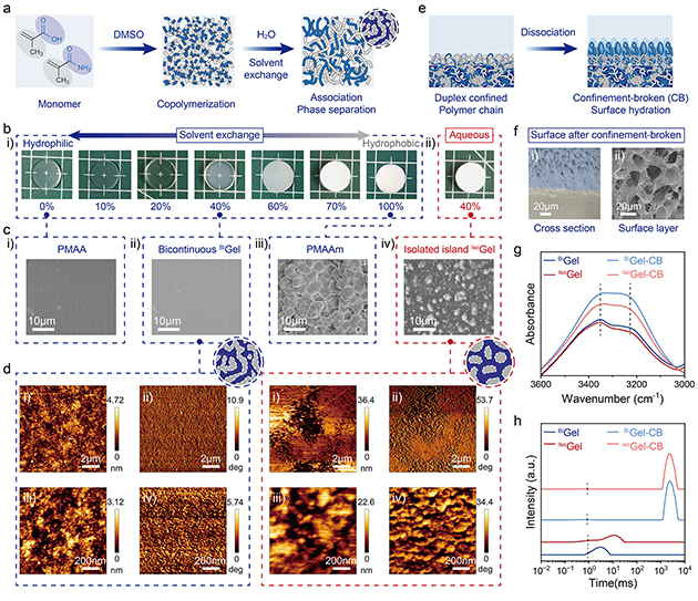 圖2. (a) 通過溶劑交換策略制備結(jié)構(gòu)可調(diào)線性共聚物水凝膠網(wǎng)絡(luò)的示意圖。(b) 不同MAAm含量(摩爾分?jǐn)?shù))水凝膠的宏觀光學(xué)照片。(c) 不同水凝膠的掃描電鏡圖像。(d)BiGel和IsoGel的原子力顯微鏡高度圖與相圖。(e) 表面限域破壞處理形成潤滑層的示意圖。(f)?BiGel-CB截面掃描電鏡圖像,顯示梯度結(jié)構(gòu)。(g)?BiGel、IsoGel及其限域破壞后樣品表面的ATR-FTIR光譜。(h) 不同水凝膠的LF-NMR T?弛豫時(shí)間分布。