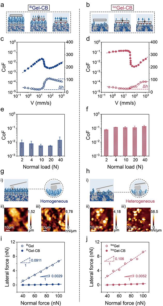 圖4.(a)?BiGel-CB和(b)?IsoGel-CB的潤滑機(jī)制示意圖。(c, d)?BiGel-CB和IsoGel-CB的Stribeck曲線及相應(yīng)水合高度變化。(e, f) 在邊界潤滑狀態(tài)下,摩擦系數(shù)隨載荷的變化。(g, h)?BiGel-CB和IsoGel-CB表面的AFM高度圖。(k, l) 利用LFM測得的側(cè)向力-法向力曲線及計(jì)算得出的微觀摩擦系數(shù)。
