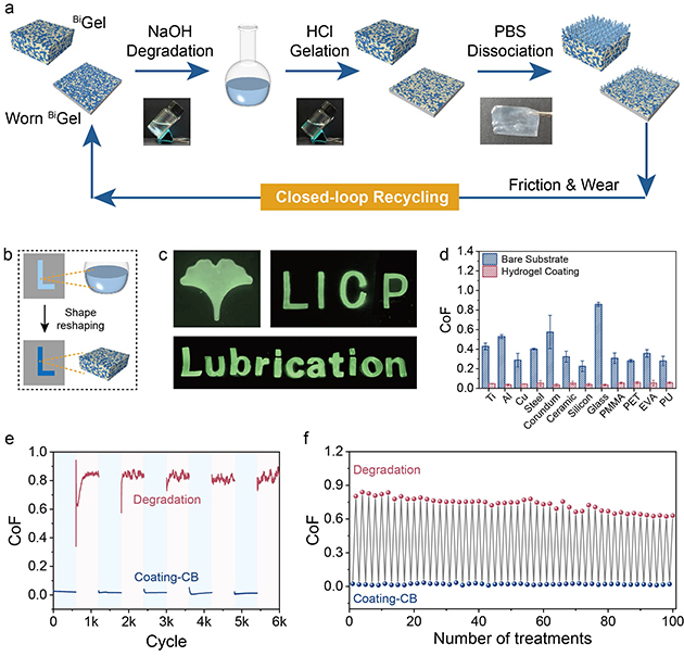 圖6.(a) 魯棒潤滑系統(tǒng)的閉環(huán)回收示意圖。(b) 形狀重塑過程示意圖。(c) 制造的不同形狀水凝膠圖案(銀杏葉、研究所徽章“LICP”、文字“Lubrication”)。(d) 水凝膠涂層與相應(yīng)裸基底摩擦系數(shù)的對比。(e) 降解-重建循環(huán)過程中的摩擦系數(shù)曲線及(f)平均摩擦系數(shù)值對比(以玻璃為基底,“處理次數(shù)”以奇數(shù)次代表涂層、偶數(shù)次代表降解來表征)。