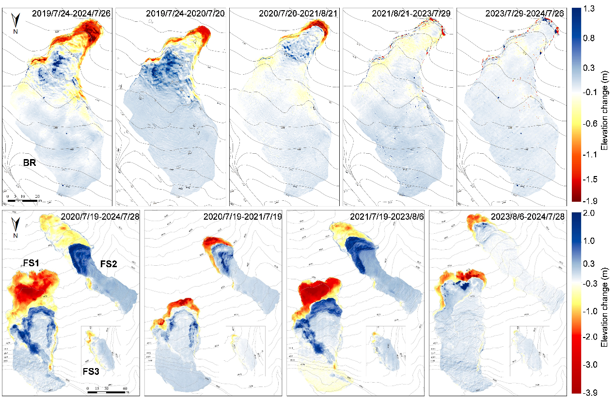 研究實(shí)現(xiàn)了對(duì)小尺度熱融滑塌四維時(shí)空動(dòng)態(tài)演變的精確量化,獲取了高精度的滑塌面積擴(kuò)張、后緣后退、地表物質(zhì)運(yùn)動(dòng)和體積變化等核心參數(shù),明確了青藏高原熱融滑塌月度、年度和總體變化特征,深化了對(duì)其內(nèi)部物質(zhì)遷移和擴(kuò)張過程的認(rèn)識(shí),為青藏高原多年凍土區(qū)熱融滑塌的碳動(dòng)態(tài)評(píng)估及工程走廊基礎(chǔ)設(shè)施安全提供了關(guān)鍵科學(xué)依據(jù)。