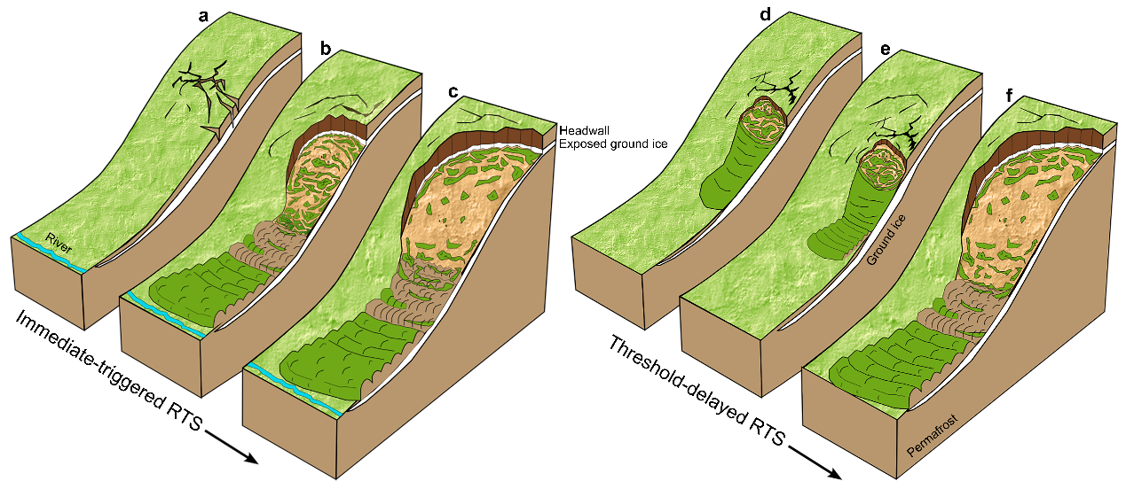 即時(shí)觸發(fā)型和閾值延遲型熱融滑塌演化路徑