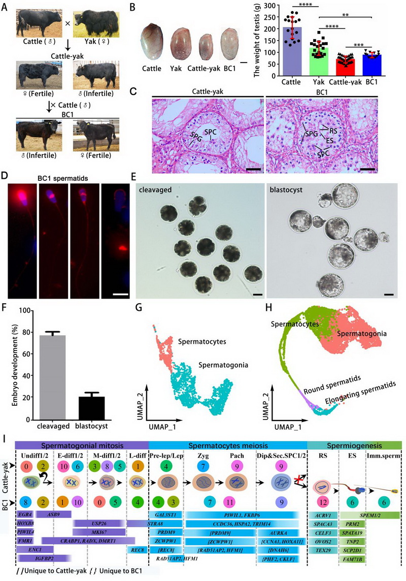 論文代表圖1:普通牛和牦牛雜交后代和回交睪丸組織單細胞圖譜分析。A) 普通牛與牦牛雜交產(chǎn)生犏牛及其回交后代(BC1)的模型示意圖。B) 牦牛、家牛、犏牛及BC1的睪丸重量對比,比例尺 = 2 厘米;普通牛(n = 18)、牦牛(n = 21)、犏牛(n = 37)和BC1(n = 13)的睪丸重量進行兩兩比較。C) 犏牛(左)和BC1(右)睪丸組織的蘇木精-伊紅(H&E)染色切片。比例尺 = 50 μm。在犏牛中未觀察到精母細胞階段以后的生精細胞,而與犏牛相比,BC1的生精缺陷有所緩解。SPG:精原細胞,SPC:精母細胞,RS:圓形精子細胞,ES:伸長精子細胞。D) 從BC1睪丸中分離出的精子細胞頂體染色。比例尺 = 10 μm。E & F) BC1精子細胞胞質內注射入牦牛卵母細胞后獲得了部分卵裂期胚胎和囊胚期胚胎;比例尺 = 50 μm。G) 犏牛生殖細胞的UMAP標注圖,僅識別出兩種亞型:精原細胞和精母細胞。H) BC1生殖細胞的UMAP標注圖,識別出精原細胞、精母細胞、圓形精子細胞和伸長精子細胞。I) 犏牛和BC1生殖細胞各簇中特定標記基因的表達情況,可用于細胞類型鑒定。