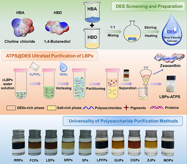 高效、精準(zhǔn)的分離純化是開展多糖精細(xì)結(jié)構(gòu)解析和活性研究的重大難題,而樣品前處理是多糖分離純化的重要基礎(chǔ)和前提。傳統(tǒng)多糖分離純化的樣品前處理技術(shù)包括脫脂、脫蛋白和脫色等過程,不僅操作繁雜、時間冗長,而且會導(dǎo)致多糖流失、結(jié)構(gòu)變化和活性失活等。針對上述問題,課題組提出了將低共熔溶劑(Deep Eutectic Solvents,DES)引入雙水相體系(Aqueous Two-Phase System,ATPS)的新思路,構(gòu)建了新型ATPS@DES多糖樣品前處理新體系,實現(xiàn)了枸杞多糖同步脫脂、脫蛋白和脫色;同時,在此溫和、綠色的條件下,實現(xiàn)了枸杞多糖高保留率和最大程度保持多糖的原始結(jié)構(gòu)特征。