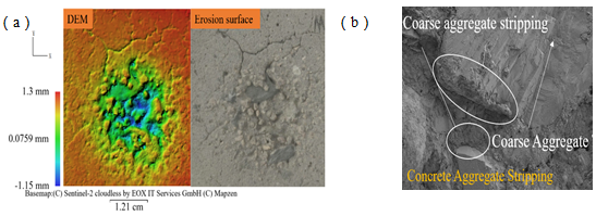 風(fēng)沙流速為30 m/s,風(fēng)沙攻角為90°,磨蝕時間為8 min時混凝土磨蝕試件的微觀形貌分析:(a)運(yùn)動結(jié)構(gòu)重建(SfM)獲得三維表面形態(tài);(b)掃描電鏡(SEM)二維表面分析