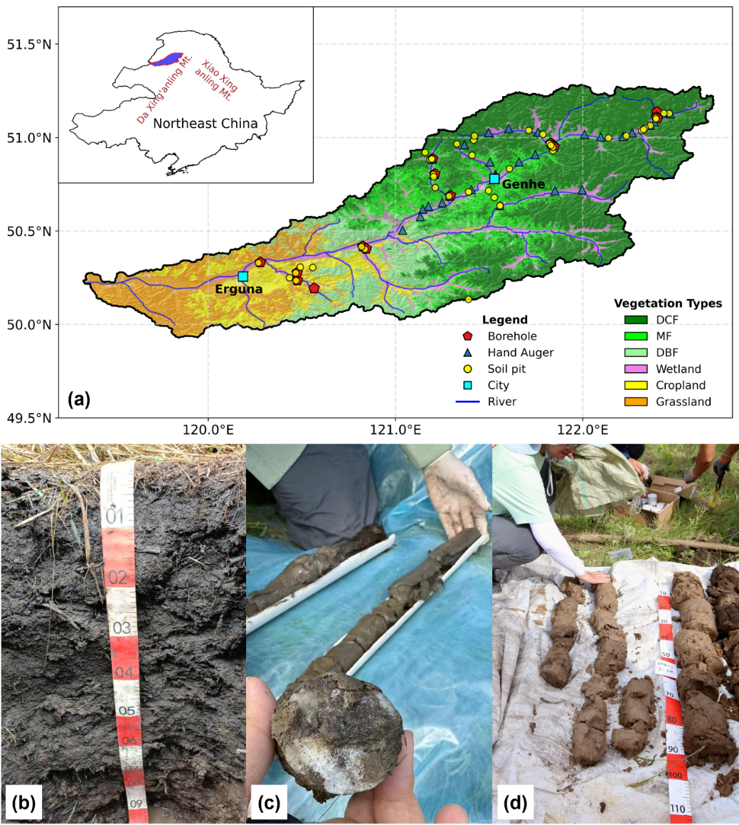 研究團(tuán)隊(duì)在根河流域布設(shè)75個(gè)淺層土壤剖面和15個(gè)深達(dá)20米的鉆孔,獲取了覆蓋森林、草地、濕地等不同下墊面的土壤含水量觀測(cè)數(shù)據(jù)。并結(jié)合可解釋機(jī)器學(xué)習(xí)與結(jié)構(gòu)方程模型,系統(tǒng)揭示了邊緣多年凍土區(qū)土壤水分的“垂向分層”特征及其控制機(jī)制。