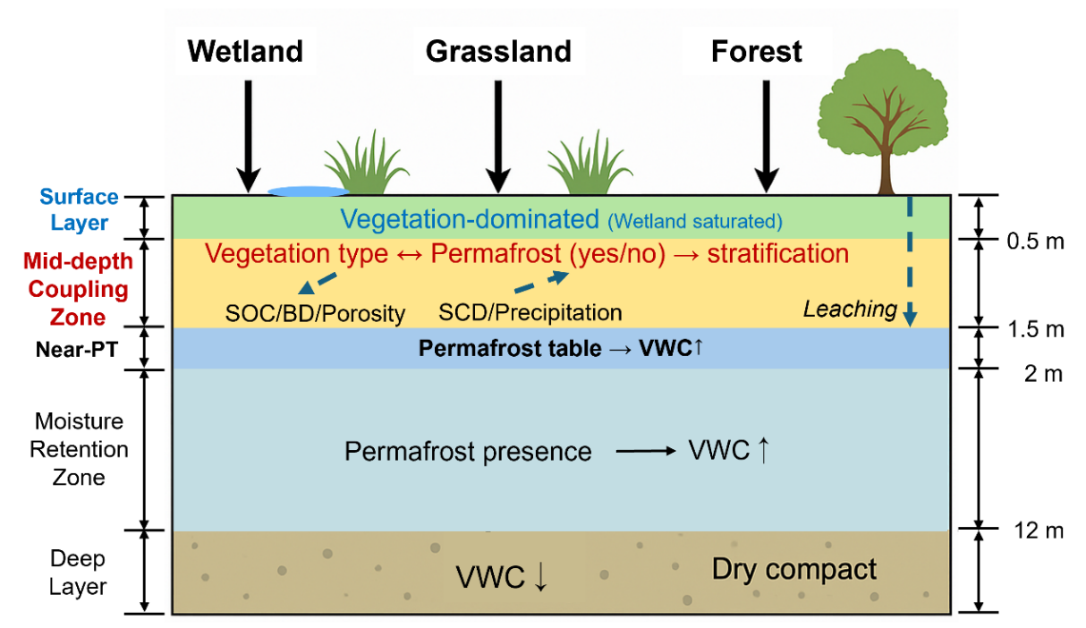 研究結(jié)果顯示,濕地覆蓋、土壤有機(jī)碳等地表與土壤屬性主導(dǎo)了淺層水分分布,土壤容重和多年凍土分布控制了深層蓄水與水分維持。氣候因子則主要通過改變地表溫度條件與凍融過程,間接影響水分結(jié)構(gòu)與分層格局。