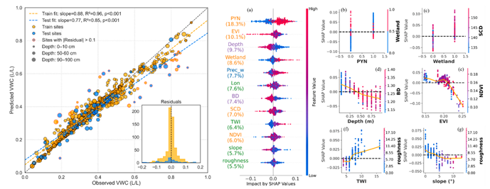 該數(shù)據(jù)產(chǎn)品表現(xiàn)優(yōu)異(R2 = 0.85, RMSE = 0.08 L/L),能精準(zhǔn)刻畫凍土與濕地共同塑造的“河谷濕潤(rùn)走廊”及干燥高地的空間分異,彌補(bǔ)了SMAP等全球粗分辨率產(chǎn)品難以解析深層與亞公里尺度異質(zhì)性的不足,為寒區(qū)流域水文模擬與生態(tài)管理提供了可移植的制圖方案與高精度基礎(chǔ)數(shù)據(jù)。