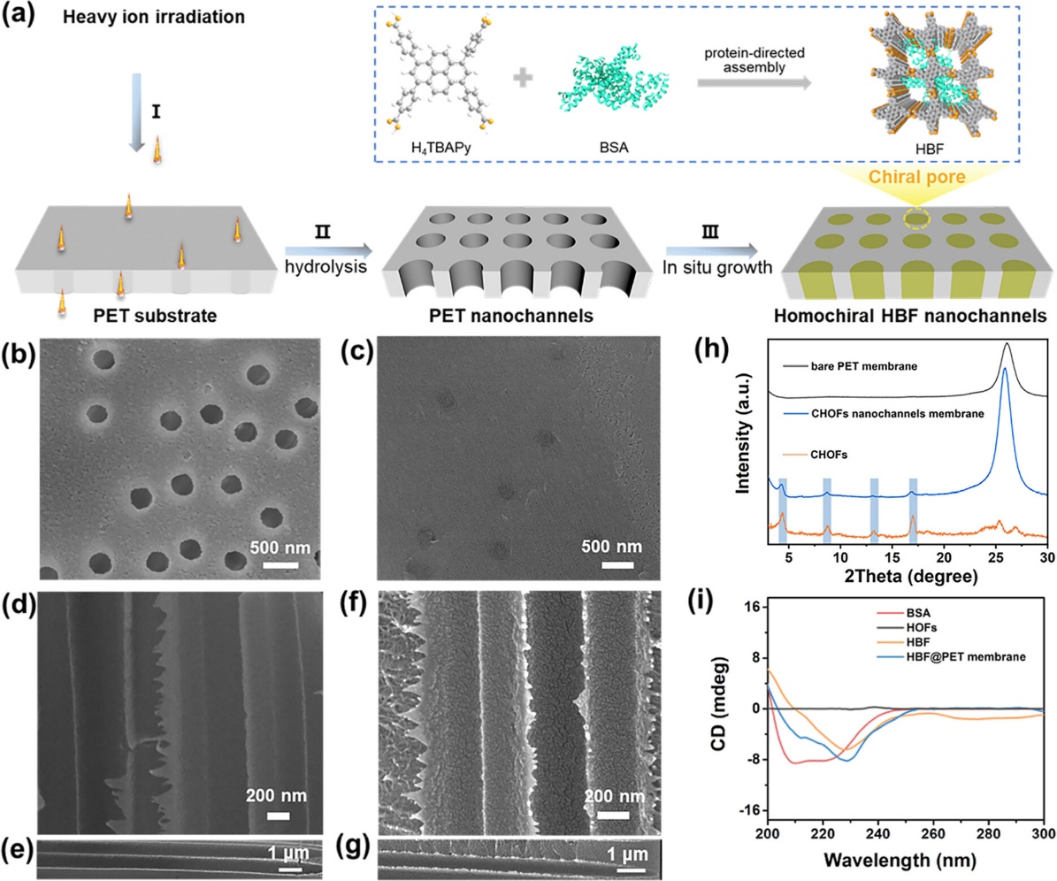 近日,中國科學(xué)院近代物理研究所重離子科學(xué)與技術(shù)全國重點實驗室材料研究中心與蘭州大學(xué)化學(xué)化工學(xué)院、東江實驗室合作,在手性分離膜研究方面取得重要進展。研究團隊依托蘭州重離子加速器(HIRFL)提供的重離子輻照技術(shù),成功制備出一種具有同手性特征的氫鍵生物雜化框架核孔膜(HBF@PET),實現(xiàn)了對氨基酸對映體的高效、精準(zhǔn)分離。相關(guān)成果于近日發(fā)表在國際化學(xué)期刊《美國化學(xué)會志》(Journal of the American Chemical Society)上。