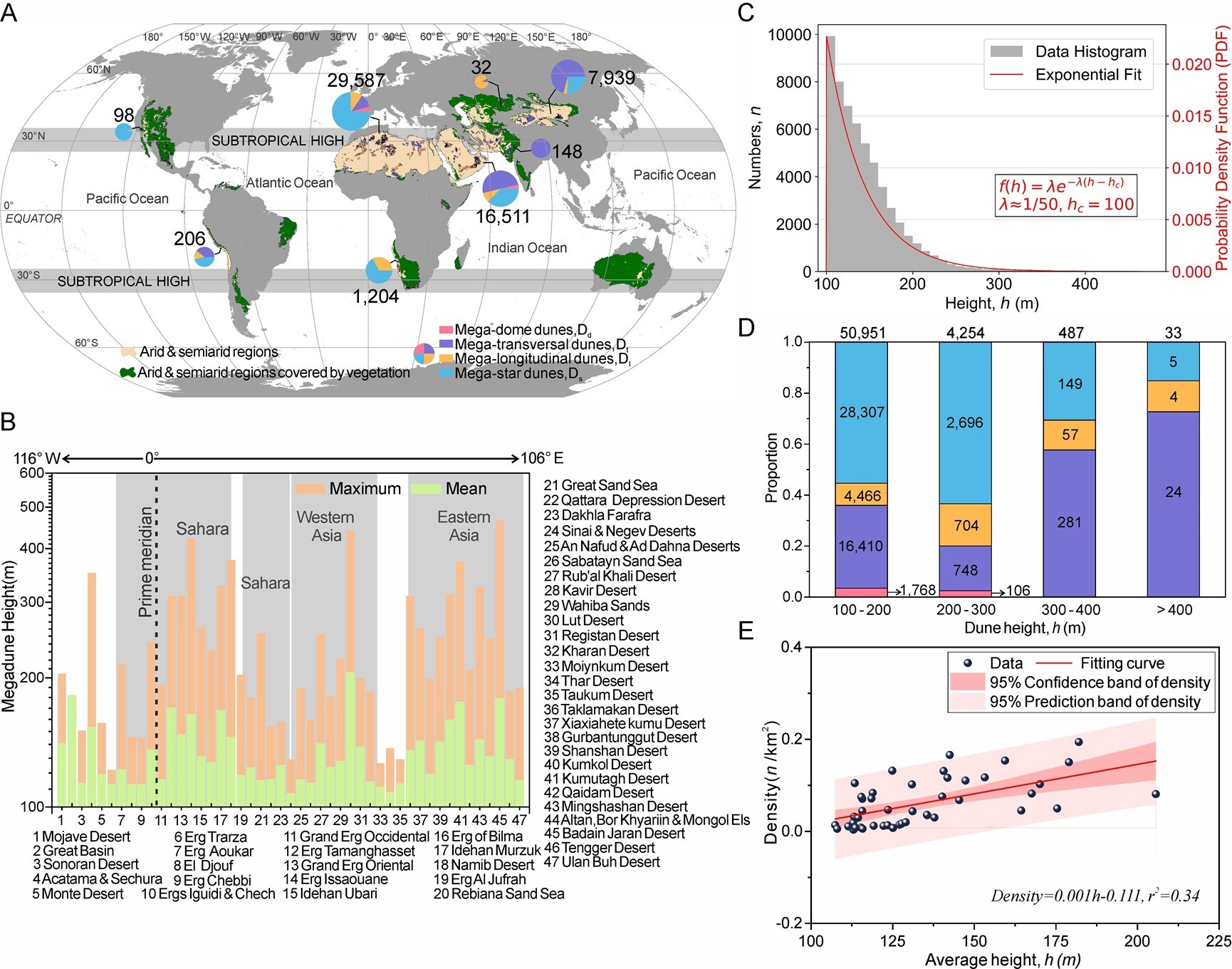 研究發(fā)現(xiàn),全球97%以上高大沙山集中于撒哈拉沙漠與亞洲干旱區(qū),充足沙源與強(qiáng)勁風(fēng)力是沙山發(fā)育的基礎(chǔ)條件;澳大利亞沙漠因植被覆蓋度高、輸沙量有限,而未發(fā)育沙山。全球近91%的沙山高度介于100–200米,且以星狀沙山為主,表明多向風(fēng)況更利于沙山的形成;高度超300米后以橫向沙山為主,超過400米的沙山僅有33座。空間上,大陸內(nèi)部沙丘場沙山平均高度更高且沙山密度隨沙山平均高度升高而顯著增加。