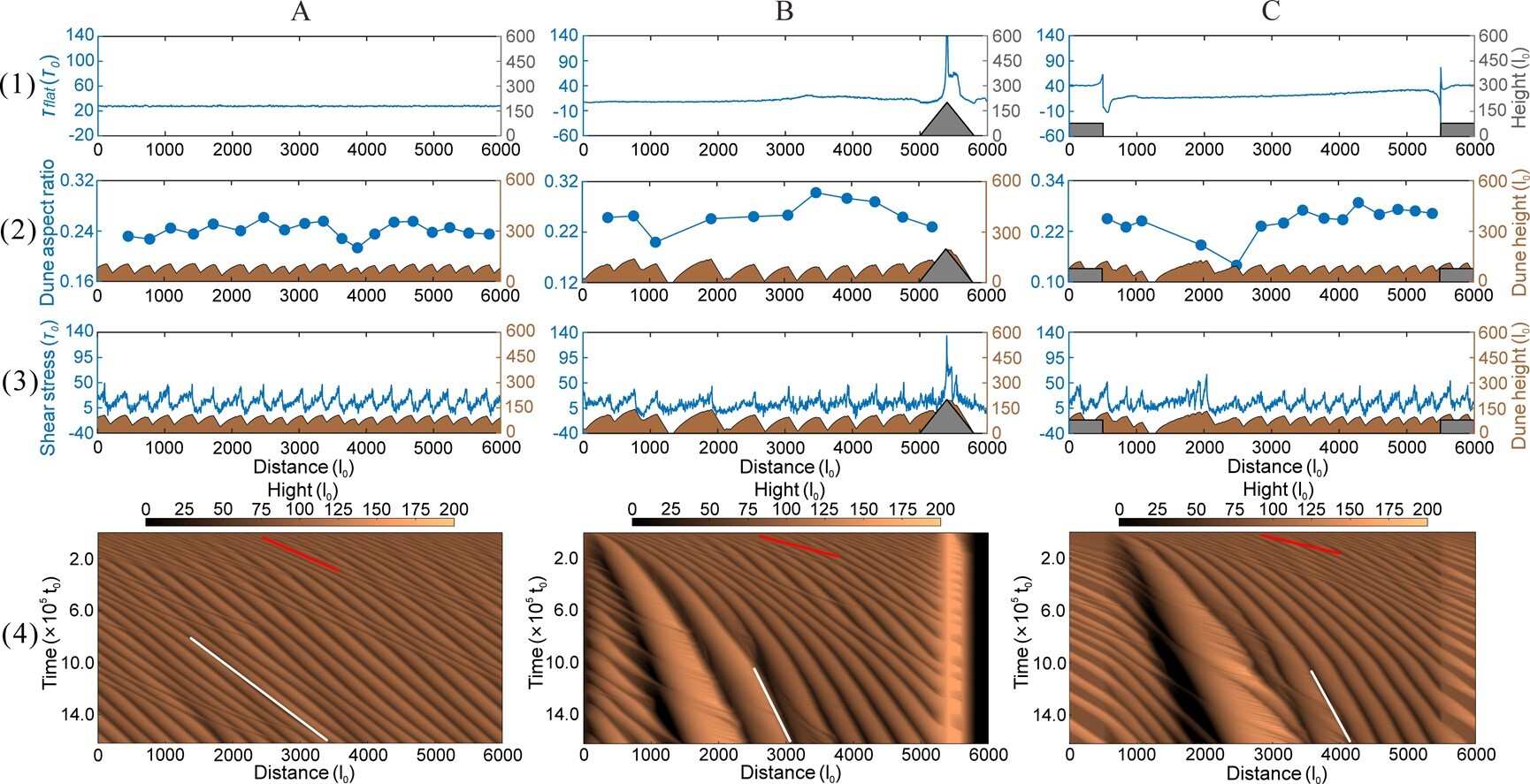 數(shù)值模擬結(jié)果揭示了沙山發(fā)育的核心機(jī)制:平坦地形下沙物質(zhì)均勻分配,抑制高大沙山發(fā)育;山體、盆地等正負(fù)地形引發(fā)剪切應(yīng)力突變,增強(qiáng)沙通量匯聚與沙丘碰撞融合,加速沙丘“粗化”長高。地形通過持續(xù)塑造風(fēng)場與沙源空間異質(zhì)性,成為高大沙山形成的關(guān)鍵動(dòng)力。