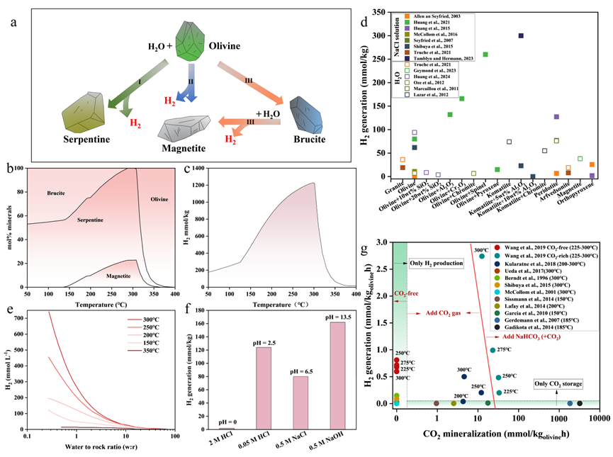 含F(xiàn)e(II)礦物的水熱反應(yīng)生成氫氣。(a)橄欖石水熱反應(yīng)生成氫氣的示意圖;(b)在 50 兆帕壓力和水巖比為 1 的條件下,隨著溫度變化預(yù)測(cè)的橄欖石水熱反應(yīng)中的平衡礦物組合;(c)在 50 兆帕壓力和水巖比為 1 的條件下,基于熱力學(xué)模型計(jì)算的橄欖石水熱反應(yīng)中氫氣生成量隨溫度的變化情況;(d)不同礦物在純水和氯化鈉溶液系統(tǒng)中氫氣生成量的比較;(e)在低水巖比(0.01)條件下,氫氣生成量顯著增加;(f)在不同 pH 條件下,輝長(zhǎng)巖熱液反應(yīng)產(chǎn)生的氫氣;(g)橄欖石熱液反應(yīng)過(guò)程中的氫氣生成及二氧化碳礦化