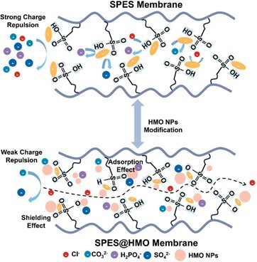 研究團(tuán)隊(duì)設(shè)計(jì)的SPES@HMO氯離子膜,利用磺化聚醚砜(SPES)基質(zhì)含有高密度的帶負(fù)電磺酸基團(tuán)(-SO3H),通過介電排斥作用阻礙陰離子的傳輸。同時(shí),水合氧化錳(HMO)納米顆粒在SPES基質(zhì)中均勻分散,通過電荷屏蔽效應(yīng)調(diào)節(jié)界面電荷環(huán)境,從而增強(qiáng)氯離子的滲透性,實(shí)現(xiàn)了靜電調(diào)控和競(jìng)爭(zhēng)性吸附相結(jié)合的作用機(jī)制。實(shí)驗(yàn)結(jié)果表明,這種協(xié)同機(jī)制顯著提升了氯離子的選擇性。在Cl-與CO32-的分離測(cè)試中,氯離子通量維持1.30×10-3 mol·m-2·min-1時(shí),膜的離子選擇性高達(dá)1295.36。該技術(shù)的開發(fā)對(duì)鹽湖高純產(chǎn)品開發(fā)具有重要意義,同時(shí)該膜還可應(yīng)用于工業(yè)廢水處理和海水淡化等領(lǐng)域,實(shí)現(xiàn)特定離子的精準(zhǔn)分離。