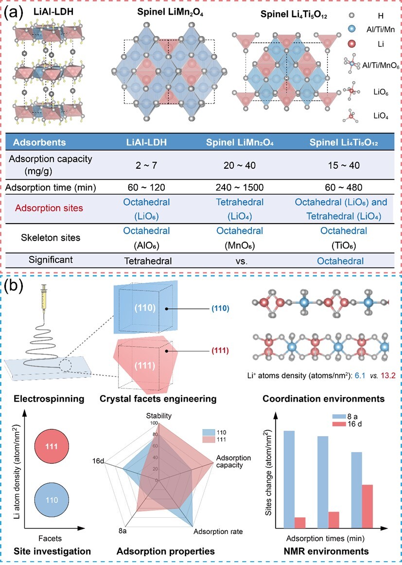 在提高吸附容量方面,研究團(tuán)隊通過表面配位環(huán)境(coordination environment)的調(diào)節(jié)策略,即不同晶面上四面體與八面體配位點(diǎn)分布的精確調(diào)控,實現(xiàn)對鋰離子吸附動力學(xué)與容量的協(xié)同控制。同時揭示了鋰離子在材料中的遷移機(jī)制:鋰離子首先進(jìn)入四面體位點(diǎn)作為“擴(kuò)散入口”,隨后逐步遷移至更穩(wěn)定的八面體位點(diǎn)實現(xiàn)儲存。闡明了富含四面體位點(diǎn)的(110)晶面能夠降低鋰離子進(jìn)入材料結(jié)構(gòu)的能壘,使鋰離子快速進(jìn)入材料內(nèi)部,從而顯著提升吸附速率;而具有更均衡配位環(huán)境的(111)晶面則能夠提供更穩(wěn)定的鋰離子儲存位點(diǎn),從而實現(xiàn)更高的平衡吸附容量。該研究從原子尺度闡明了配位環(huán)境對鋰離子吸附行為的調(diào)控機(jī)制,為高容量吸附材料設(shè)計提供思路。