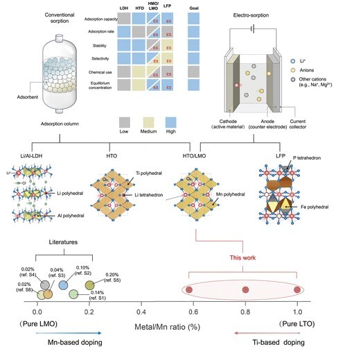 傳統(tǒng)鹽湖提鋰技術(shù)依賴太陽能蒸發(fā)濃縮,具有成本低廉優(yōu)勢,但先提鉀后提鋰工藝流程長,各階段鋰夾帶損失大,導(dǎo)致提高鋰收率成為鹽湖資源開發(fā)的急切需求。近年來,電控吸附技術(shù)在直接提鋰(Direct Lithium Extraction, DLE)上因其高效、綠色環(huán)保的優(yōu)勢,成為鹽湖資源提取的重要發(fā)展方向。然而,在多離子競爭環(huán)境下實現(xiàn)鋰離子的高選擇性、離子高速傳輸及材料長期穩(wěn)定性,仍是該領(lǐng)域面臨的核心科學(xué)問題。針對上述挑戰(zhàn),中國科學(xué)院青海鹽湖研究所劉忠研究員帶領(lǐng)的離子吸附科學(xué)與技術(shù)團(tuán)隊,長期致力于鹽鹵離子分離材料、工藝、和裝備的系統(tǒng)研發(fā)。團(tuán)隊在多類吸附材料研究中,鈦吸附劑因離子選擇性高,鈦氧鍵結(jié)構(gòu)穩(wěn)定性好,其工業(yè)化前景十分廣闊。但在實際電控吸附過程中,如何提高離子和電子傳輸,同步實現(xiàn)高吸附容量和高電化學(xué)反應(yīng)速率,仍然是使用過程中面臨的難題。