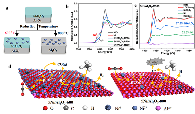 圖1.(a) Ni0/NiAl2O4/Al2O3制備示意圖; (b) 各還原溫度下的催化劑歸一化Ni K-edge XANES光譜;(c) 5Ni/Al2O3-R600的線性組合擬合(LCF)結(jié)果;(d)催化劑5Ni/Al2O3-600和5Ni/Al2O3-800的DRM反應(yīng)機理示意圖
