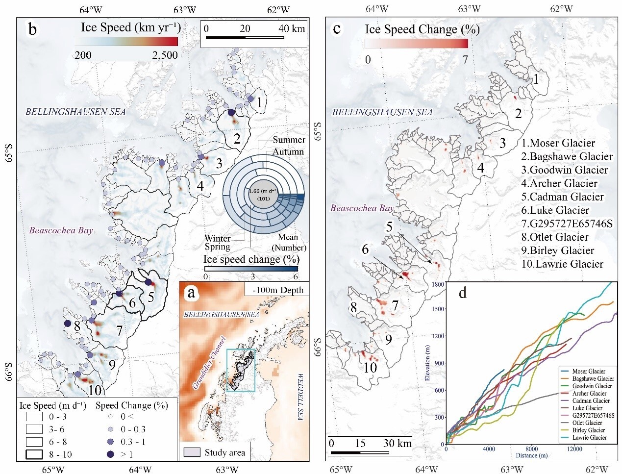 中國(guó)科學(xué)院西北生態(tài)環(huán)境資源研究院冰凍圈科學(xué)與凍土工程全國(guó)重點(diǎn)實(shí)驗(yàn)室康世昌研究員團(tuán)隊(duì),基于2015年5月至2025年4月的Sentinel-1衛(wèi)星觀測(cè)數(shù)據(jù),系統(tǒng)分析了南極半島Beascochea海灣101條冰川流速變化特征,重點(diǎn)揭示了海灣上層海水變暖對(duì)冰川流速加快的關(guān)鍵作用。