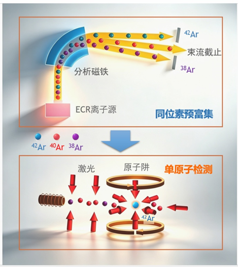 圖1 :大氣42Ar的測量。來自大氣的氬氣樣品先經(jīng)過預(yù)富集處理,除去大部分40Ar。富集后的氬樣品被送入原子阱系統(tǒng),進(jìn)行42Ar同位素的單原子探測