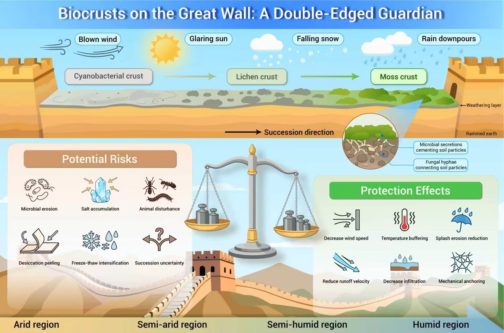 研究指出,生物結(jié)皮可為土長城遺址提供生態(tài)兼容的保護(hù)屏障,從而為夯土長城提供保護(hù),但其實(shí)際保護(hù)效果取決于保護(hù)作用與損害風(fēng)險(xiǎn)之間的消長平衡,這一平衡受到氣候環(huán)境、墻體材質(zhì)與生物結(jié)皮演替階段的共同制約。