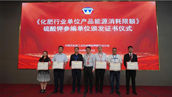 會(huì)議期間,還進(jìn)行了《化肥行業(yè)單位產(chǎn)品能源消耗限額》(《化肥行業(yè)單位產(chǎn)品能源消耗限額》(GB21344)是2023年11月最新發(fā)布的化肥行業(yè)為數(shù)不多的強(qiáng)制性國(guó)家標(biāo)準(zhǔn))硫酸鉀參編單位頒發(fā)證書(shū)儀式,青海鹽湖所作為參編單位,獲標(biāo)準(zhǔn)參編單位證書(shū)。
