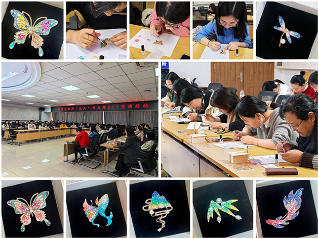 3月13日下午,組織開展了“指尖傳非遺”點翠DIY活動。培訓老師向大家介紹了中國點翠工藝非物質(zhì)文化遺產(chǎn)的歷史底蘊和文化價值,詳細講解了點翠胸針的制作過程。涂抹亮油、貼貝殼碎片、表面封層、定型……一片片細小的螺鈿片鑲嵌在胚底,斑斕色彩流動交融,鮮活生動。活動帶大家品味了傳統(tǒng)工藝的浪漫、領略了沉淀千年的藝術瑰寶。