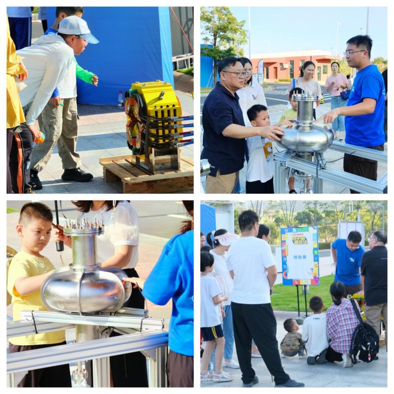 活動(dòng)形式豐富多樣,科普展廳設(shè)有強(qiáng)流重離子加速器裝置(HIAF)和加速器驅(qū)動(dòng)嬗變研究裝置(CiADS)的沙盤模型,科研人員為現(xiàn)場(chǎng)公眾詳細(xì)講解這些國(guó)家重大科技基礎(chǔ)設(shè)施的進(jìn)展。在創(chuàng)新展區(qū),展示了超緊湊旋轉(zhuǎn)束重離子治療系統(tǒng)和中國(guó)首臺(tái)碳離子治療系統(tǒng)等模型,四極磁鐵、超導(dǎo)腔等加速器實(shí)物設(shè)備也吸引了不少關(guān)注??破?qǐng)?bào)告環(huán)節(jié)中,中國(guó)科學(xué)技術(shù)大學(xué)的謝治助理研究員作了題為《追光逐日,迎接未來(lái)》的報(bào)告,介紹同步輻射領(lǐng)域的前沿知識(shí);中國(guó)科學(xué)院近代物理研究所的藍(lán)江山副研究員則以《探索微觀物質(zhì)世界的奧秘》為題,帶領(lǐng)聽(tīng)眾探索粒子物理的奧秘,現(xiàn)場(chǎng)引發(fā)了熱烈提問(wèn)。互動(dòng)體驗(yàn)是本次活動(dòng)的亮點(diǎn)。在實(shí)驗(yàn)秀中,展示了高溫超導(dǎo)磁懸浮和核孔膜超黑材料等實(shí)驗(yàn)演示;在“粒子特工訓(xùn)練基地”,孩子們通過(guò)游戲模擬重離子在加速器中的運(yùn)動(dòng),深入理解其工作原理,特邀惠州學(xué)院附屬學(xué)校學(xué)生擔(dān)任該項(xiàng)活動(dòng)特別講解員,通過(guò)。此外,創(chuàng)工坊里,孩子們?cè)诶蠋煹闹笇?dǎo)下參與科學(xué)制作,激發(fā)了他們對(duì)科學(xué)的熱情。