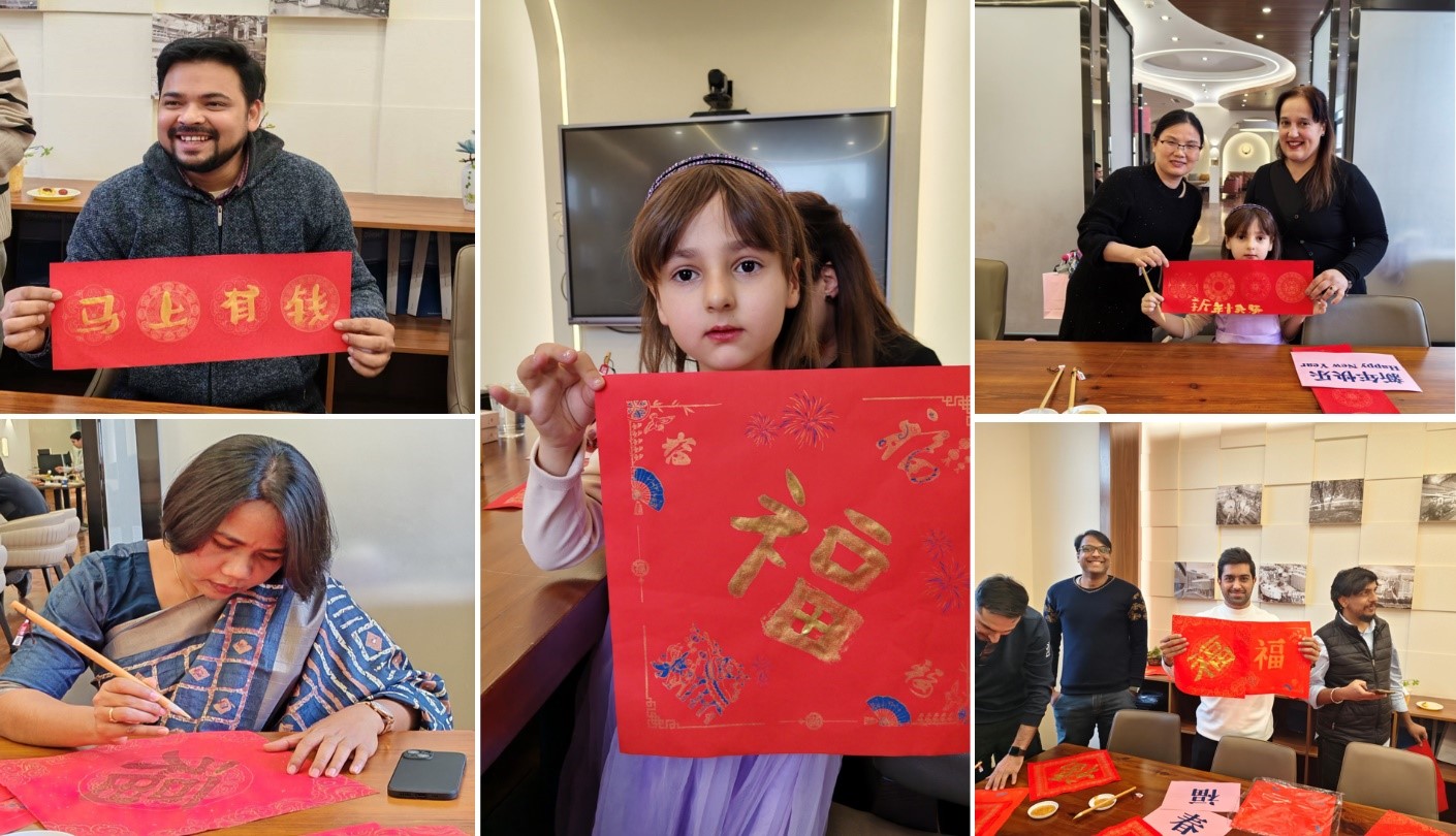 活動精彩紛呈,在充滿墨香的中國傳統(tǒng)書法體驗區(qū),外籍人員及家屬饒有興致地駐足打卡 “福字”、“對聯”書寫活動,一對對春聯、一個個福字躍然紙上,互道新年的美好祝福,近距離體驗中華傳統(tǒng)文化魅力。