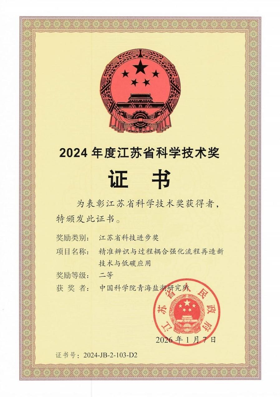 近日,江蘇省人民政府發(fā)布《關(guān)于2024年度江蘇省科學(xué)技術(shù)獎勵的決定》(蘇政發(fā)〔2026〕2號),由中國科學(xué)院青海鹽湖研究所作為第二完成單位參與完成的“精準(zhǔn)辨識與過程耦合強(qiáng)化流程再造新技術(shù)與低碳應(yīng)用”項(xiàng)目,榮獲2024年度江蘇省科技進(jìn)步二等獎。