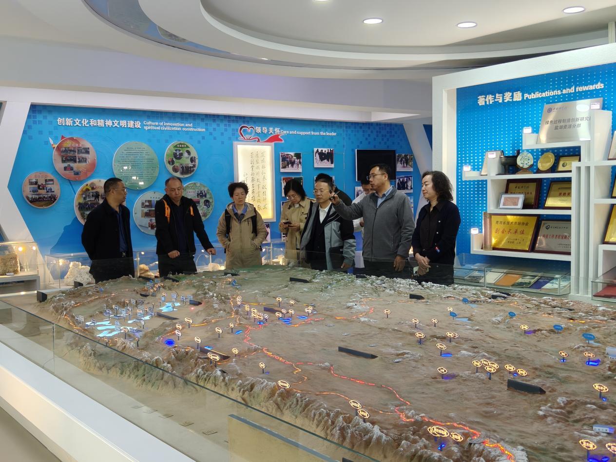 蔡方偉一行參觀了青海鹽湖所科技成果展廳,對青海鹽湖所的歷史沿革、科研平臺、人才隊伍、科研成果、重大歷史貢獻和鹽湖資源開發(fā)利用研究進展等情況進行了解。
