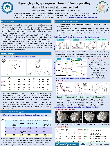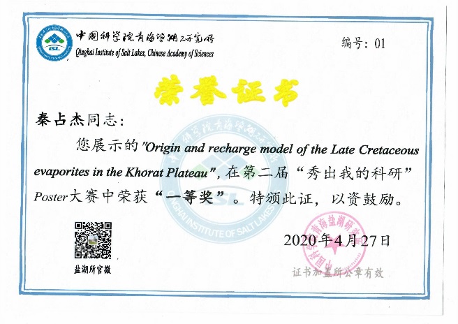 經(jīng)過專家評審和網(wǎng)絡(luò)投票,最終秦占杰博士《Origin and recharge model of the Late Cretaceous evaporites in the Khorat Plateau》和彭嬌玉博士《Research on Boron Recovery from Sulfate-type Saline Lakes with a Novel Dilution Method》,王廣國同學(xué)《Structure Study of Aqueous CaCl2 Solutions by Molecular Dynamics Simulations》和高靖易同學(xué)《Prehistoric human Activity and its Environmental Background in Lake Donggi Cona Basin, Northeastern Tibetan Plateau》分別斬獲大賽職工組和研究生組一等獎;高春亮博士等6名同志獲得二等獎,孫艷霞博士等10名同志獲得三等獎,本屆大賽為獲獎?wù)咴O(shè)計了精美的證書。
