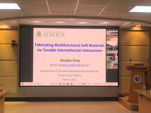 3月11日,中國科學(xué)院蘭州化學(xué)物理研究所固體潤滑國家重點(diǎn)實(shí)驗(yàn)室邀請加拿大工程院院士、加拿大阿爾伯塔大學(xué)Hongbo Zeng教授作在線學(xué)術(shù)報(bào)告,報(bào)告題目為“Fabricating Multifunctional Soft Materials via Tunable Intermolecular Interactions”。報(bào)告由副所長周峰研究員主持,相關(guān)領(lǐng)域科研人員100余人參加了報(bào)告會(huì)。