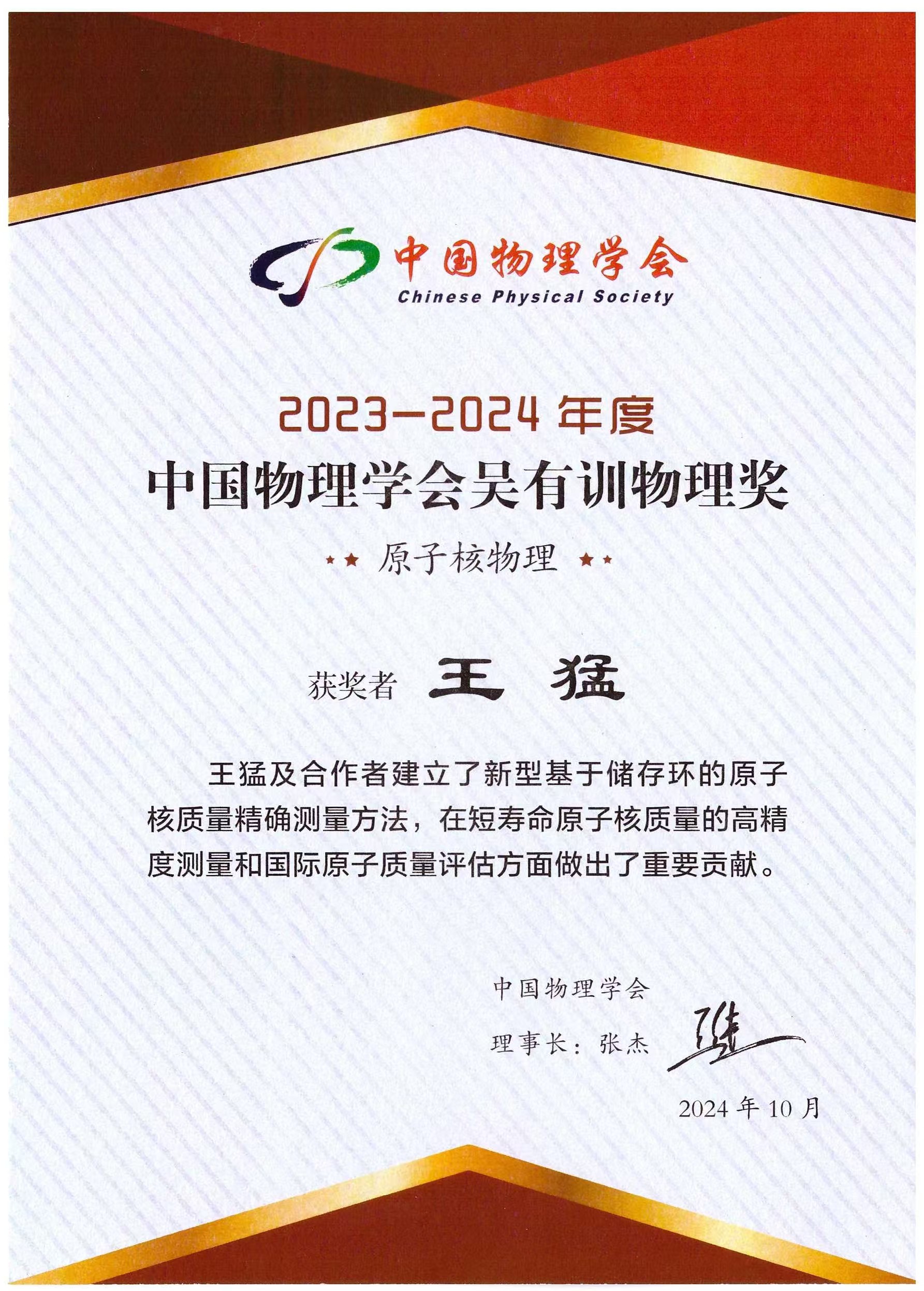 近代物理所王猛研究員獲吳有訓(xùn)物理獎(jiǎng)