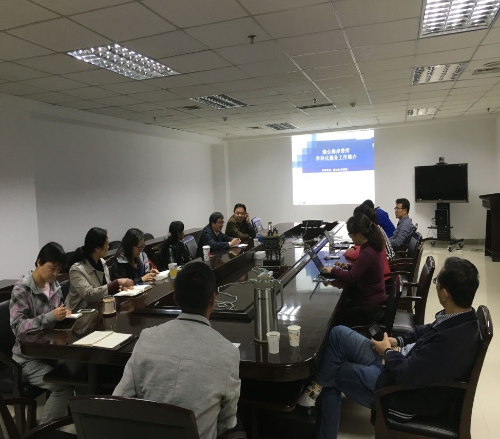 學(xué)科咨詢部主任馬建霞介紹了學(xué)科咨詢服務(wù)部的服務(wù)布局、團(tuán)隊(duì)建設(shè)、面向研究所率先行動(dòng)、分類定位改革和院重點(diǎn)實(shí)驗(yàn)室評(píng)估所開展的學(xué)科發(fā)展態(tài)勢(shì)分析和科研創(chuàng)新影響力評(píng)價(jià)工作等重點(diǎn)工作。責(zé)任學(xué)科館員陳松叢匯報(bào)了近年來面向煙臺(tái)海岸帶研究所開展的學(xué)科信息服務(wù)。