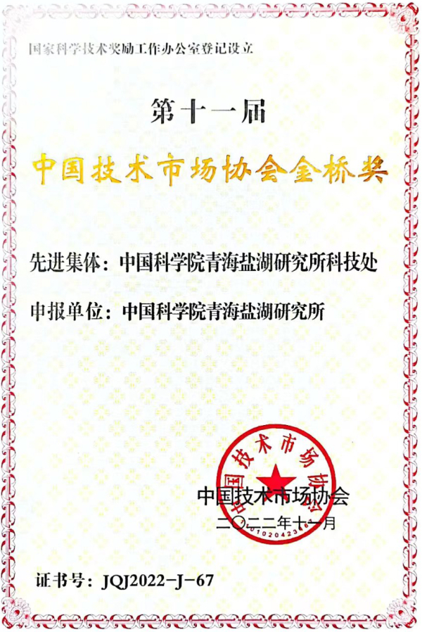 青海鹽湖所獲第十一屆中國技術(shù)市場(chǎng)協(xié)會(huì)金橋獎(jiǎng)獎(jiǎng)勵(lì)大會(huì)表彰